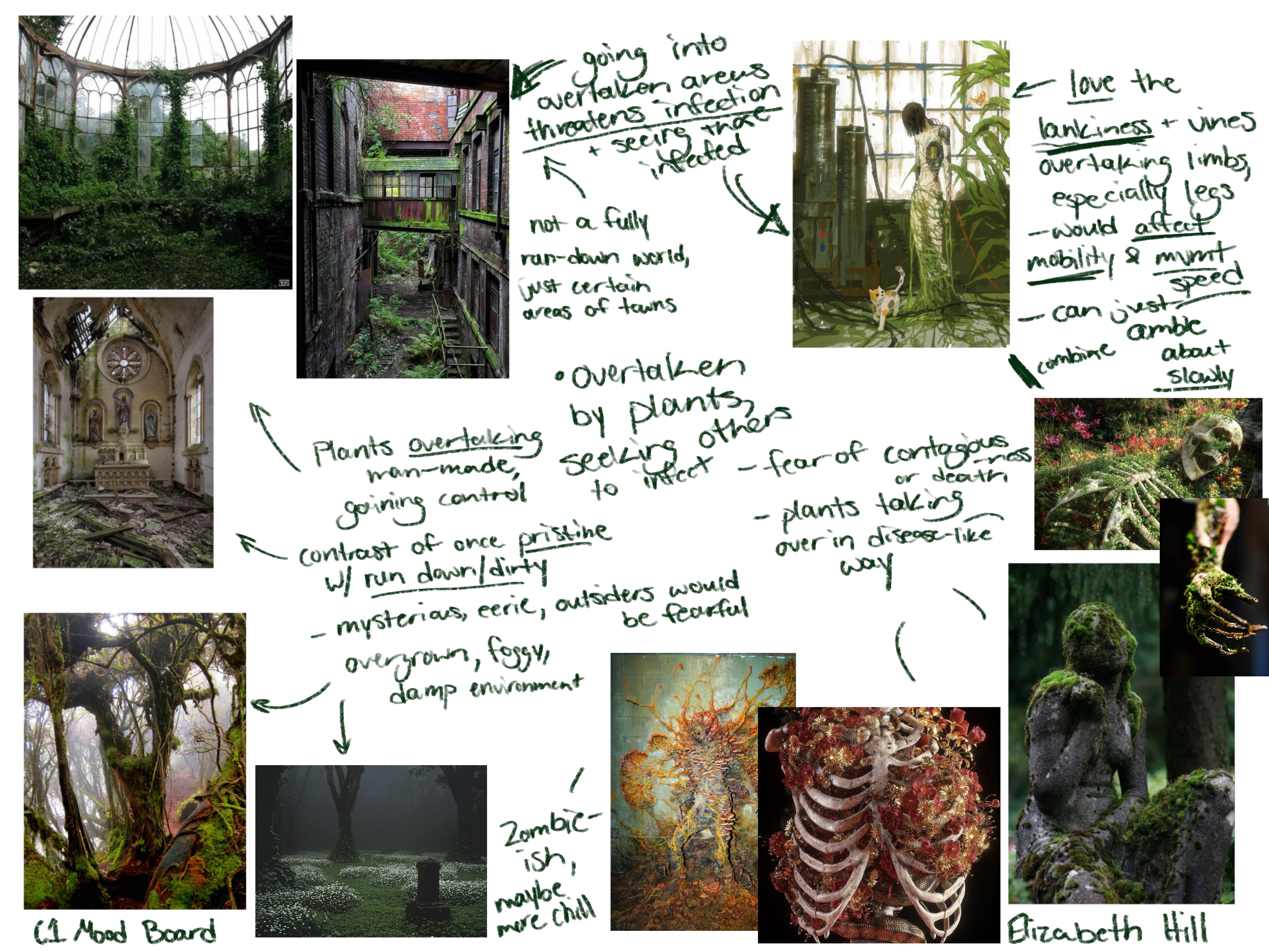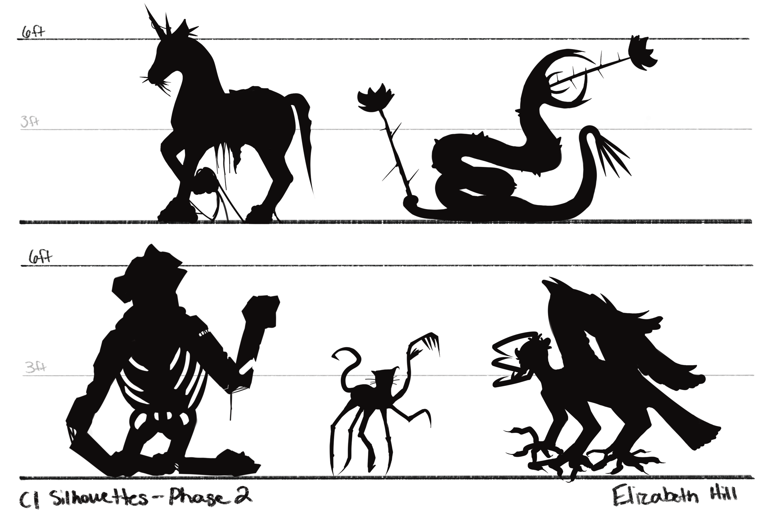 Phase 2 of the previous earthy mood board. I felt the previous page clung to humanoid figures, so I worked to avoid that with this set. I placed animal-like creatures at the mercy of the possessive plants here, having them seemingly adapted to the conditions. Each still hold organic elements that have been combined with what were their previous states (horse, snake, cat, etc.). Similarly to the first mood board and silhouettes, I attempted to focus more on shaoe language here.