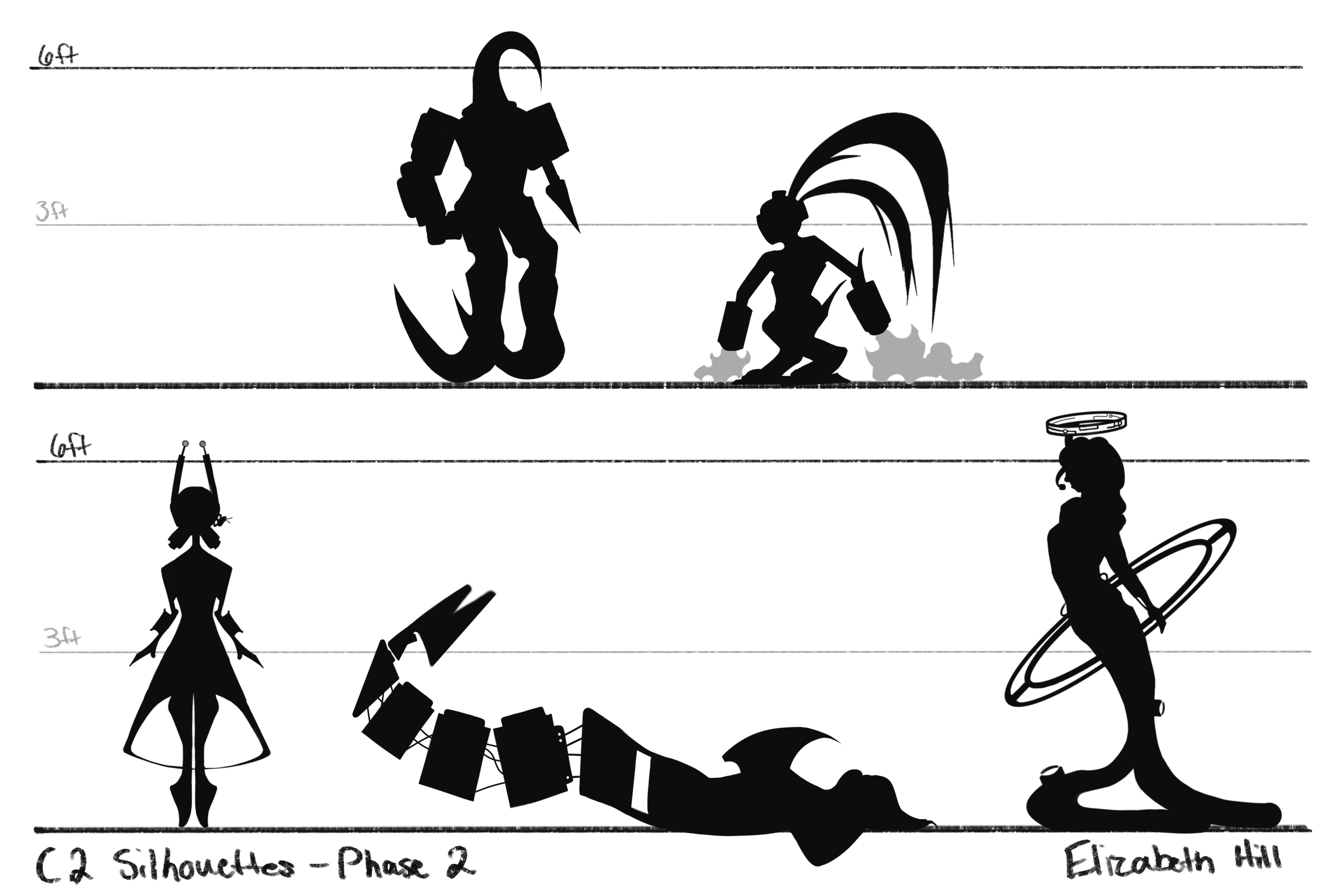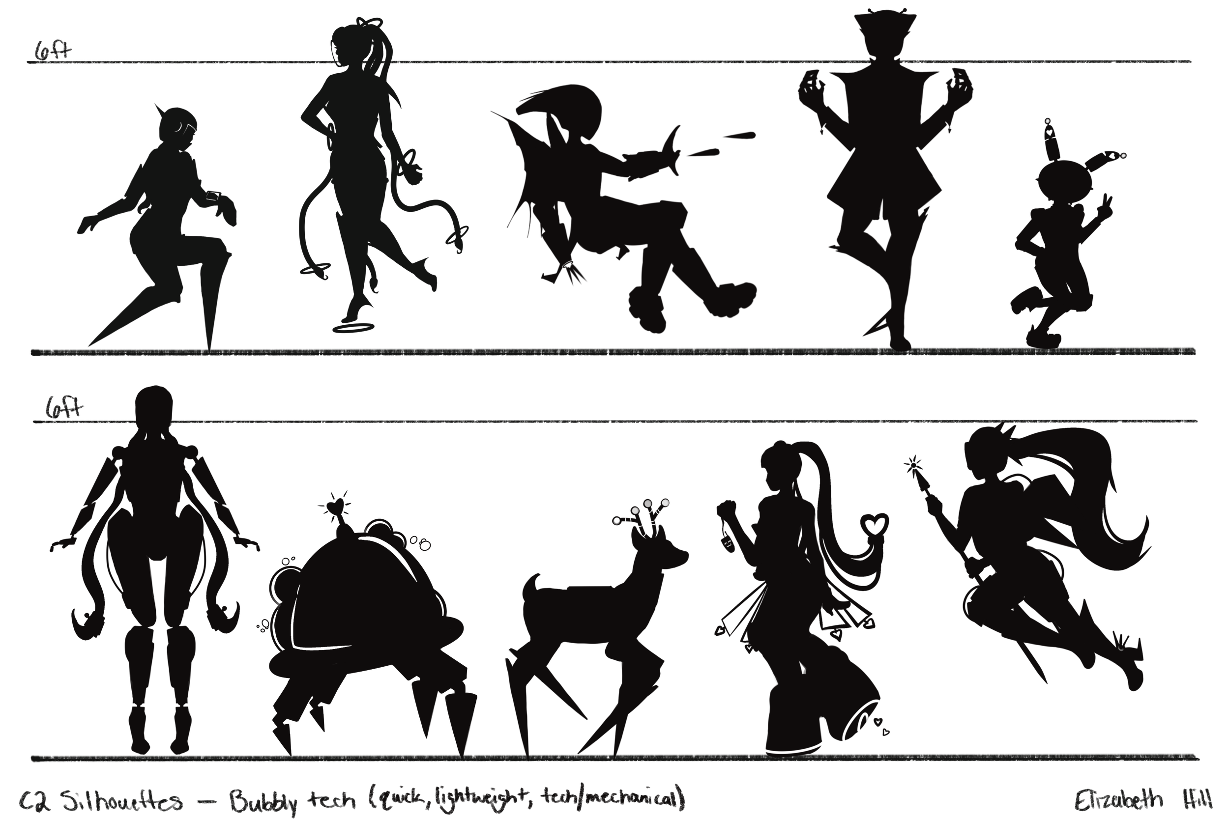 Character silhouettes inspired by a mood board evoking mechanical, futuristic, and tech-oriented vibes. Characters were kept mainly feminine, each having protruding electronic devices. I wanted it to be implied that each figure could be quick-moving and able to float or fly. To ensure this I focused on slimmer, lightweight shapes with blocky, sharp angles, as well as devices aiding fast movement (sharp legs, wings, rocets, etc.).