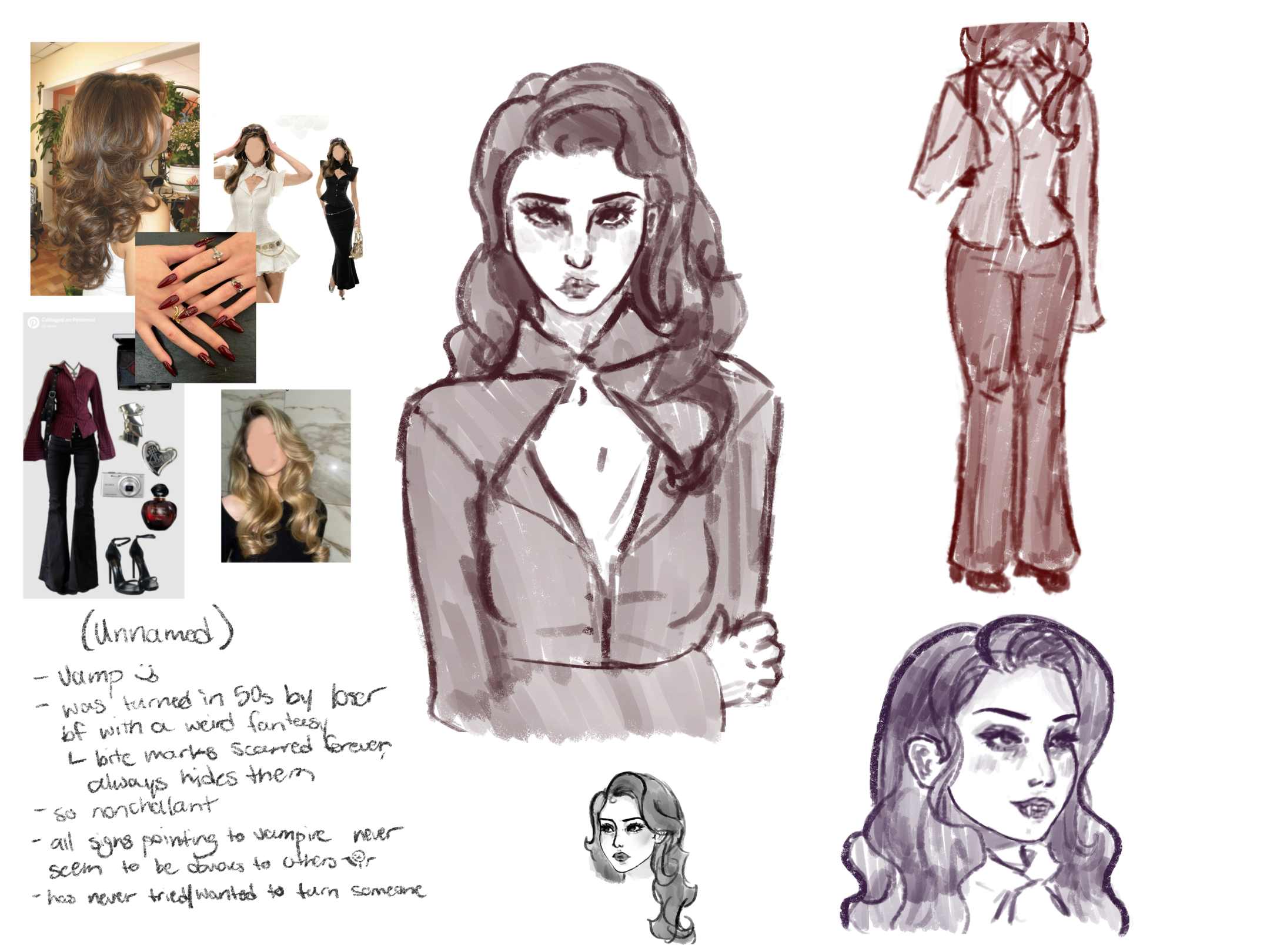 Initial mood-boarding for Amelie’s design and backstory done in December of 2025. Her default clothing and hairstyle was inspired by recent/modern-day fashion that is inspired by earlier styles, such as grunge fashion or Hollywood wave blowouts. Amelie wants a taste of what people are into today, while still holding her classy personal tastes.